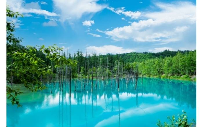 天候や時間帯によって表情を変える神秘的なコバルトブルーの池。美瑛を代表する絶景スポットで、6月は新緑の中で池の青が最も鮮やかに見えるベストシーズンです。