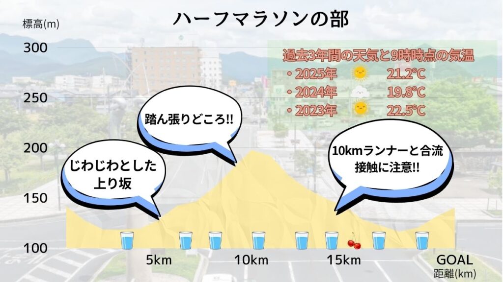 後半は下り基調となり、前半を我慢できたランナーはここでペースを上げられます。「後半の下りで自己ベスト更新」という声が多く、記録を狙いやすいコースといえます。